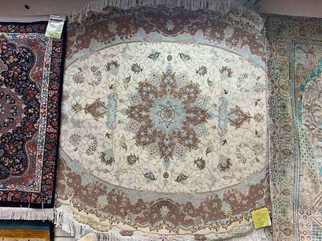 This exquisite hand-knotted Persian Tabriz rug features a distinctive oval shape and originates from Tabriz, the historic capital of the Azerbaijan Province in northwest Iran. Tabriz is one of the world’s most respected centres of Persian carpet weaving, renowned for producing fine-quality rugs with exceptionally high knot density and intricate artistic designs.