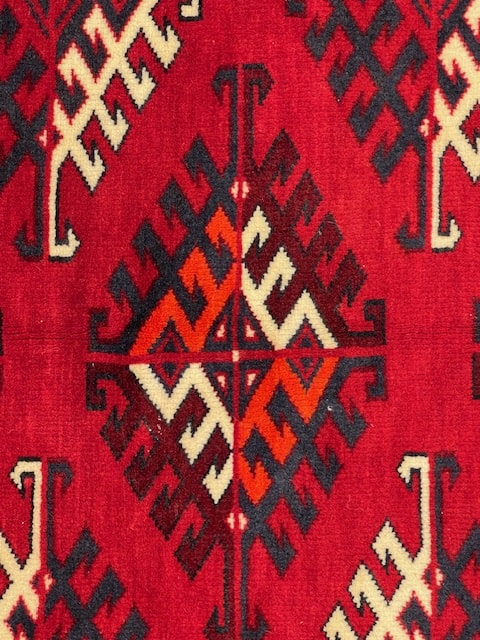 Traditional Turkman rugs often feature repeating overall patterns with symbolic motifs such as the Camel Foot, Ram’s Horn, Mirror, and Rooster Crown. These designs reflect elements of the cultural traditions and everyday life of the weaving communities.