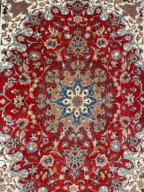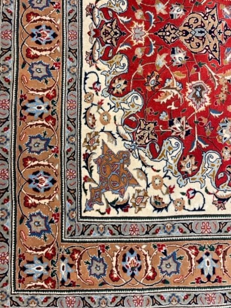 The design of this rug features a classic medallion, adorned with arabesque patterns. The medallion at the center symbolizes the “center of life,” incorporating the numerological motif of the number eight, which represents perfection. The number eight appears eight times in various motifs throughout the center, symbolizing abundance. Essentially, this design can be seen as a Mandala pattern, deeply rooted in Persian rug tradition.