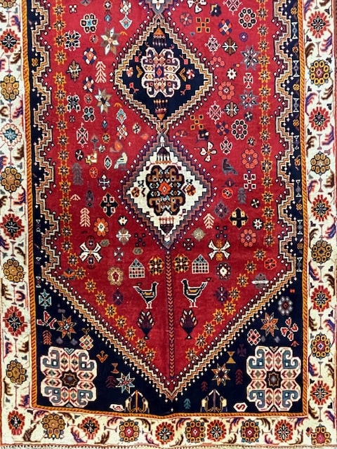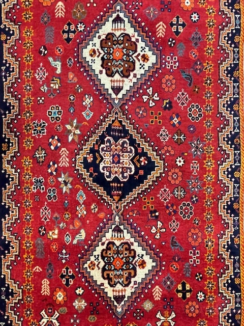 Shiraz handmade rugs are often inspired by nature, featuring lively color combinations and expressive tribal motifs. A distinctive characteristic of these rugs is the use of wool for both the pile and the weft, enhancing their strength, flexibility, and long-lasting durability.
