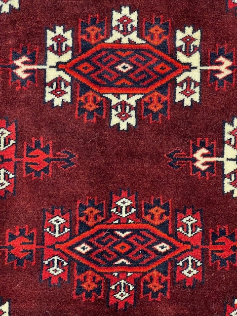 Traditional Turkman handmade rugs and carpets usually feature repeating overall patterns with symbolic motifs such as Camel Foot, Ram’s Horn, Mirror, and Rooster Crown, reflecting elements of the culture and daily life of tribal communities.