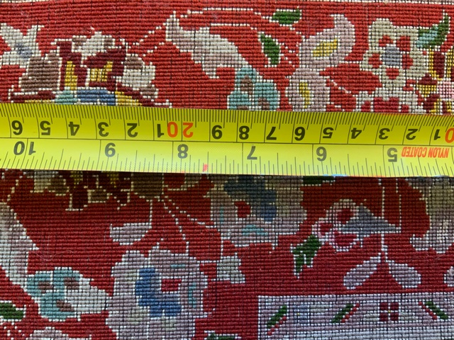 With a size of 78” x 58” (approximately 4524 square inches), the carpet contains an estimated 1,995,084 individual knots. A skilled craftsman weaving at an average rate of around 1,000 knots per hour would require approximately 1,995 hours to complete the knotting alone—excluding the additional time needed to build the loom, design and colour the pattern, and dye the wool and silk fibres.