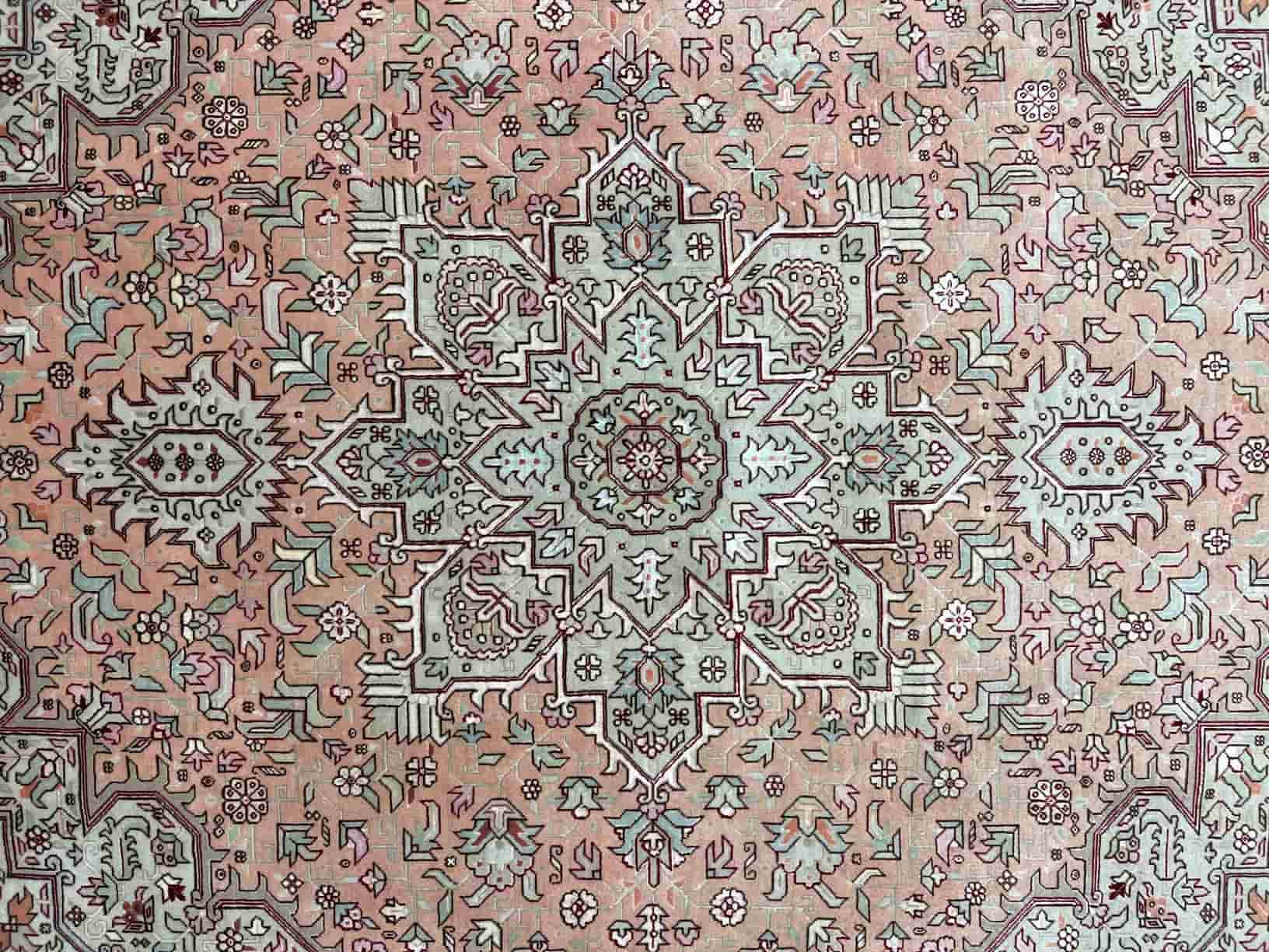 The design is known as the Heriz classic medallion with floral motif, featuring a bold central medallion balanced by elegant floral elements, creating a harmonious and timeless composition.