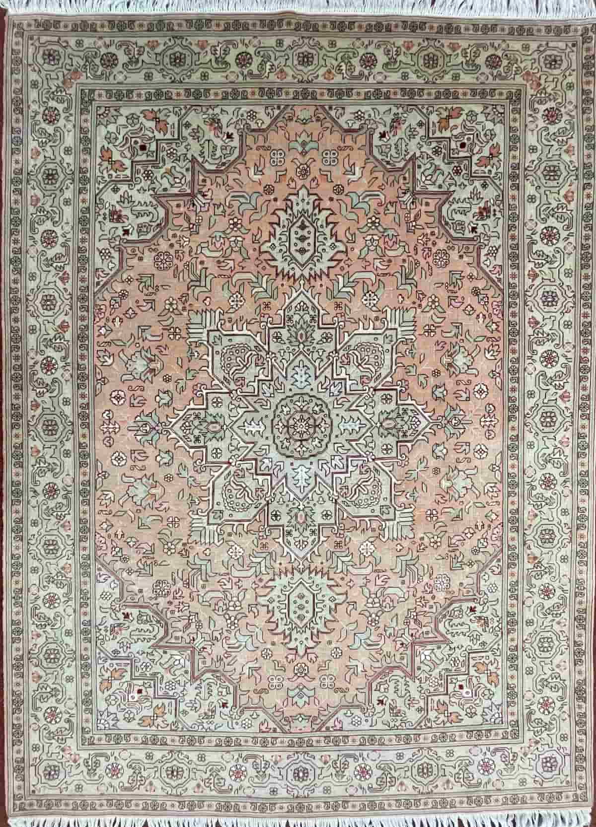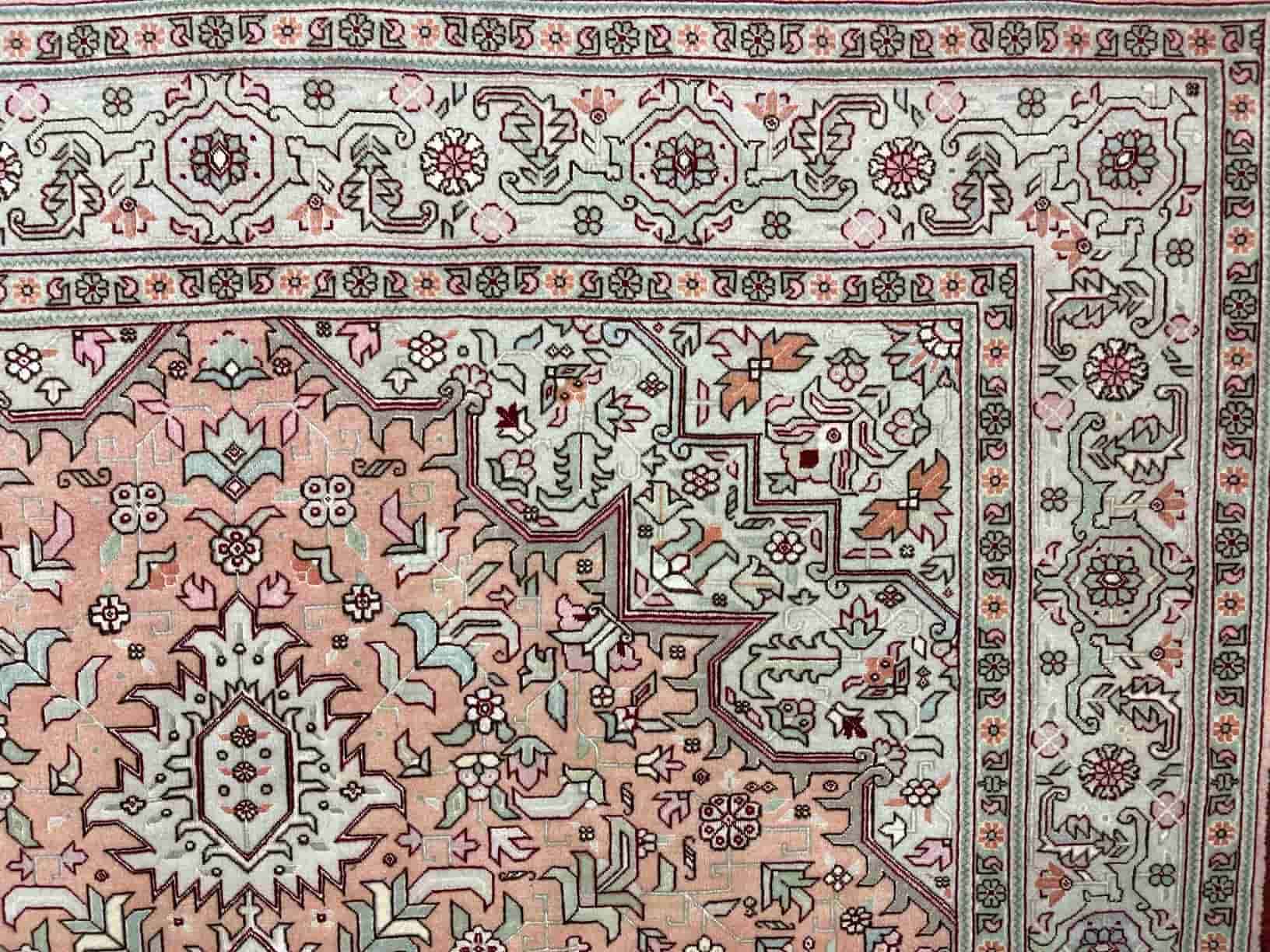 This exceptional Tabriz Persian hand-knotted rug takes its name from the historic city of Tabriz, the capital of East Azerbaijan province in Iran and one of the world’s most renowned centres for fine handmade carpets. Tabriz rugs are celebrated for their intricate artistry, high knot density, durability, and long-lasting quality.
