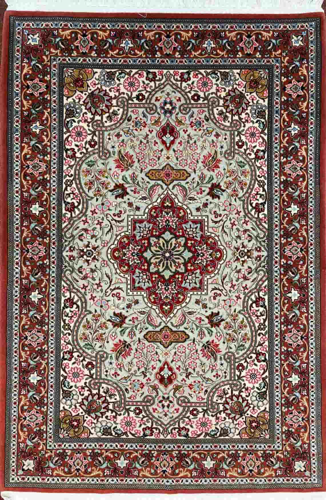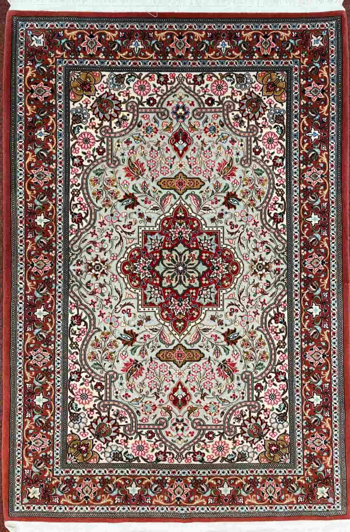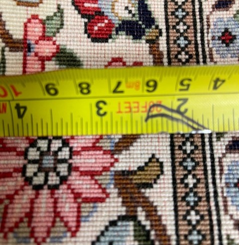 With a density of 289 knots per square inch and measuring 60 × 42 inches (2,520 square inches), this rug contains an impressive 728,280 individual knots. Given that a skilled craftsman can weave approximately 600 knots per hour, it would take around 1,213 hours to complete the weaving alone — not including the additional time required to prepare the loom, dye the materials, and carefully design and color the pattern.