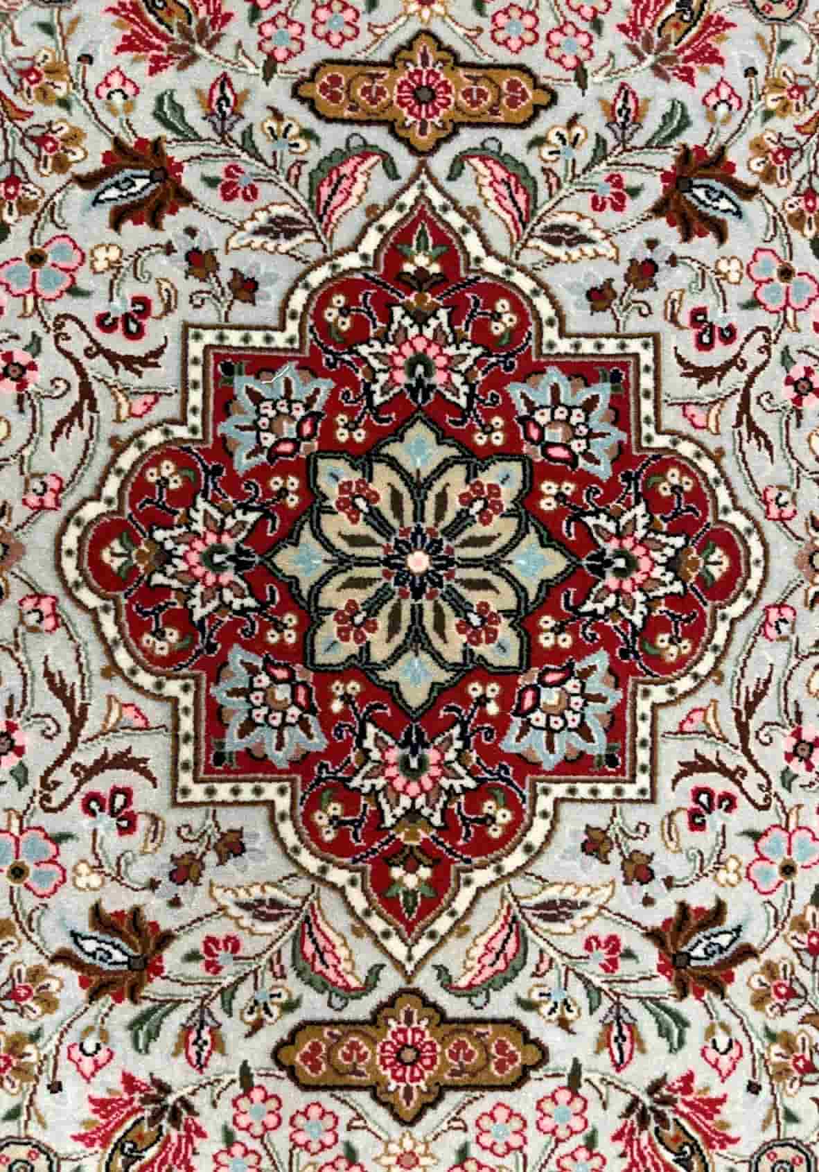 This rug features an elaborate medallion-centered design, richly adorned with floral motifs and flowing arabesques, showcasing the precision and artistry for which Qom weaving is celebrated.