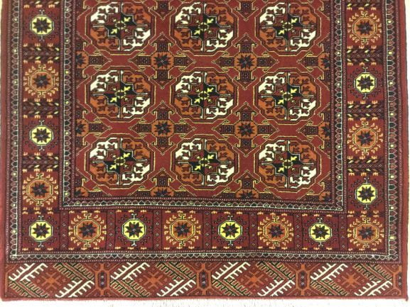 Its design features the classic Elephant Foot motif, enriched with a central star and symbolic references to the four main directions — a powerful tribal pattern deeply rooted in Turkman heritage.