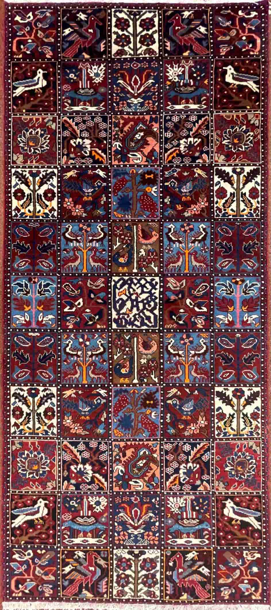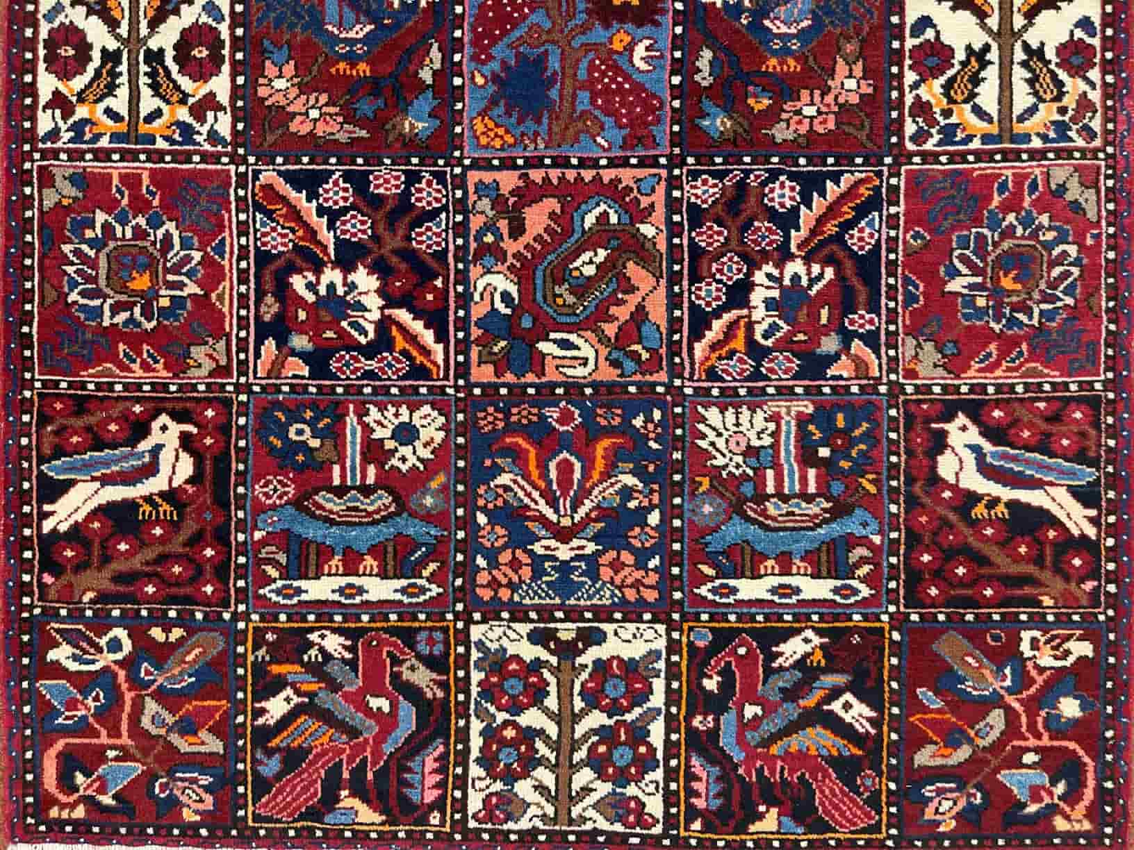 This piece features the rare and highly sought-after “Kheshti” design — a beautiful geometric composition of square panels, each filled with intricate and varied floral or symbolic motifs. The structured garden-style layout makes Kheshti Bakhtiyar rugs especially collectible and visually striking.