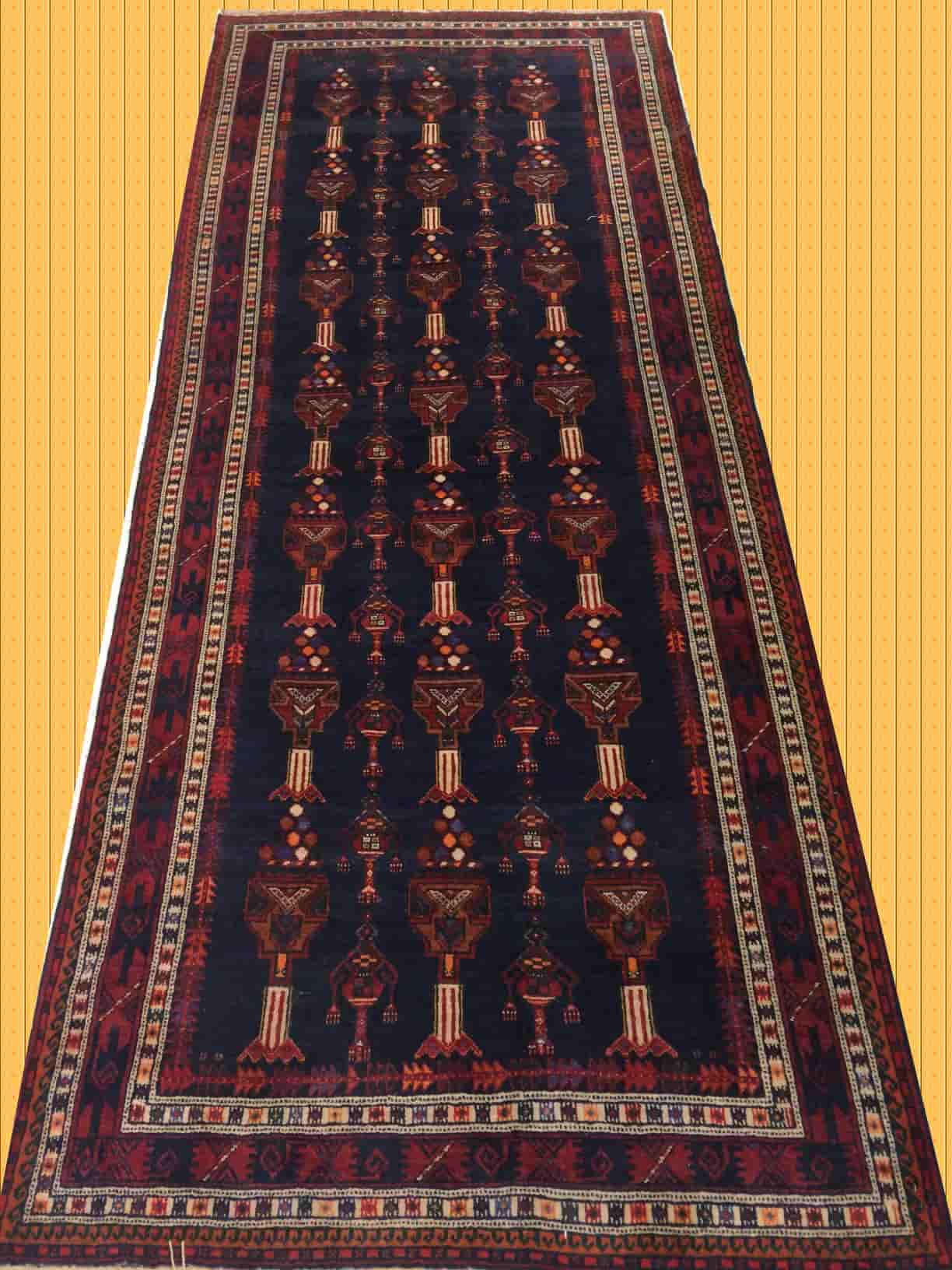Balouch runners are admired for their rich cultural symbolism and distinctive tribal artistry. The motifs in this piece include fruit pots, earrings, and necklace-inspired patterns, reflecting traditional decorative elements and nomadic heritage.