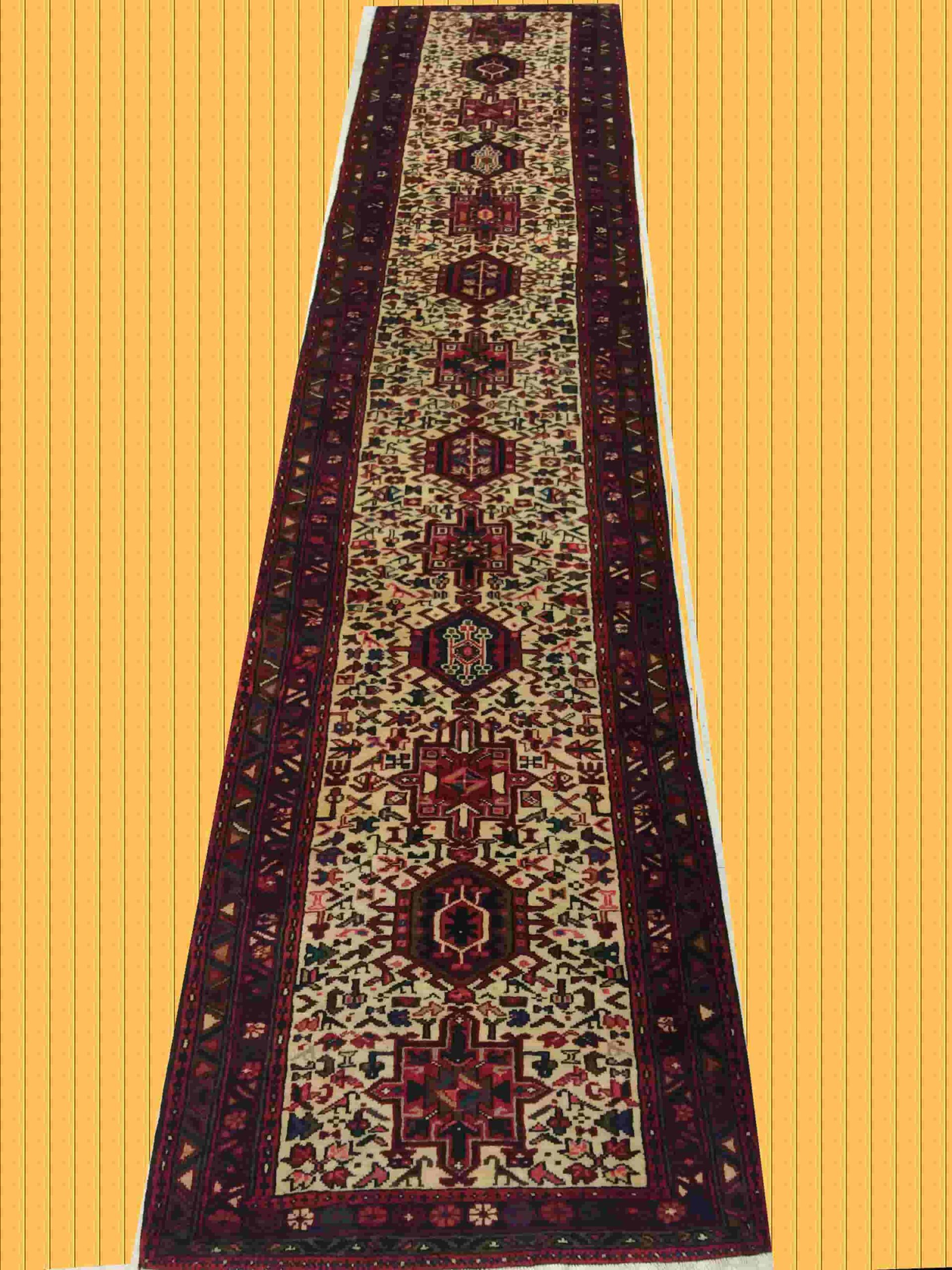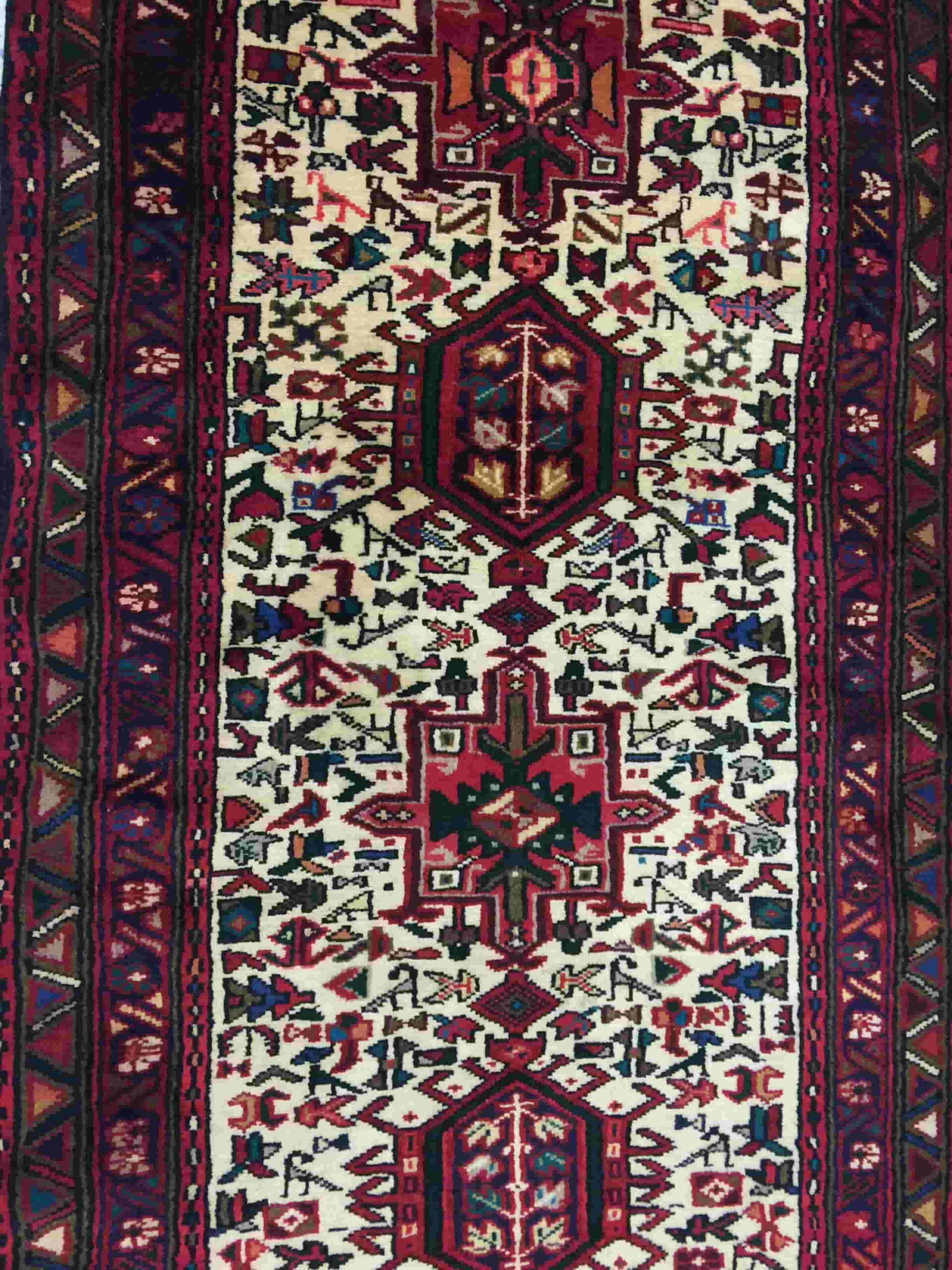 This hand-knotted Persian runner rug is a Hoseinabad, named after the historic village in northwestern Iran where it is crafted, as well as its distinctive design. Hoseinabad is celebrated for producing handmade runners that expertly combine traditional artistry with durable, practical construction.