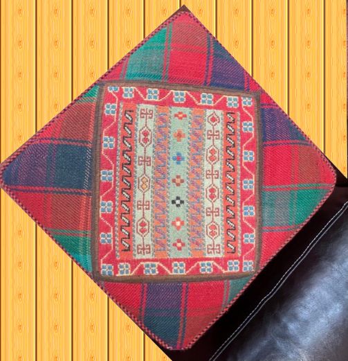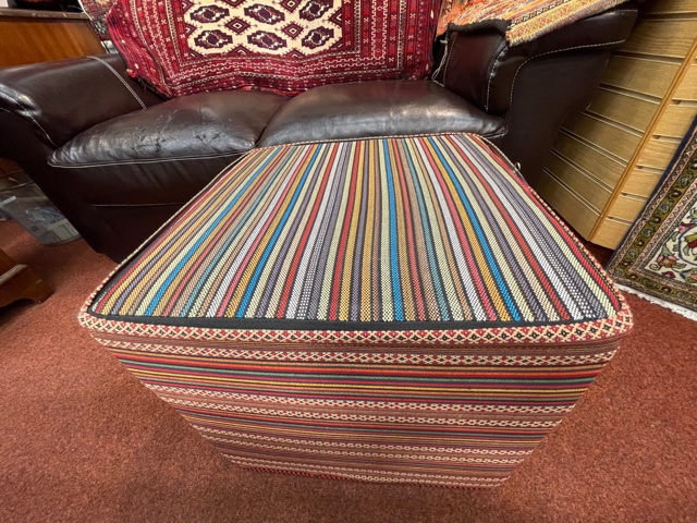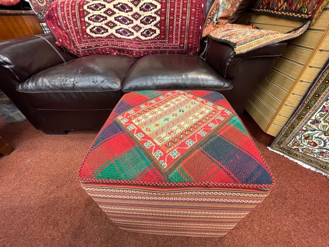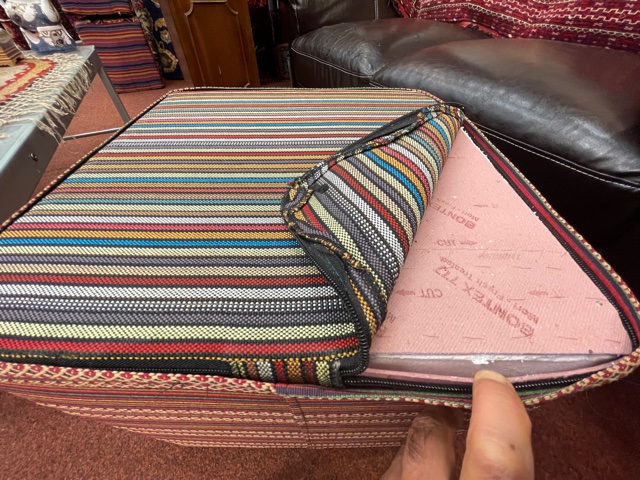 The top of this Pouffe / Seat is handmade Persian Sirjan Kelim. It has a zip at the bottom to take the filling out for cleaning the cover. The filling is polystyrene with foam on top so it is light to move it around, firm enough to sit on or put the feet up. It is very relaxing and good for blood circulation to put the feet up after a hard working day or some activity.
