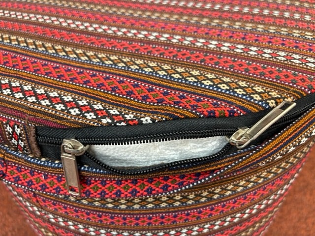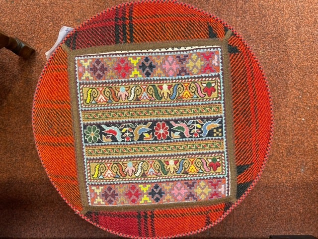 The top of this Pouffe / Seat is handmade Persian Kelim and the rest is Jajim. It has a zip at the bottom to take the filling out for cleaning the cover. The filling is polystyrene with soft foam on top. It is light to move it around, firm enough to sit on or put the feet up. It is very relaxing and good for blood circulation to put the feet up after a hard working day or some activity.
