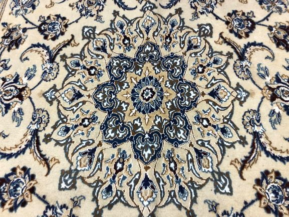 The rug features the Nain classic medallion pattern, adorned with delicate floral and leaf motifs, creating a timeless and harmonious design that enhances any living space. Its intricate detailing and balanced composition make it a standout piece in both traditional and contemporary interiors.