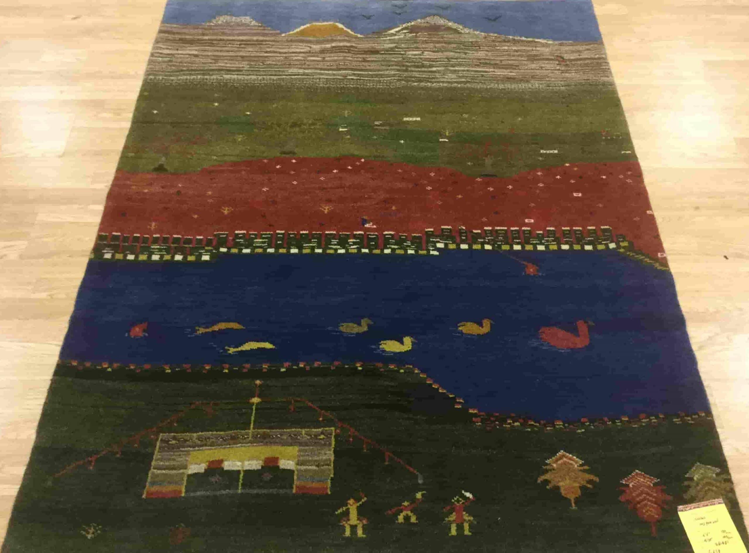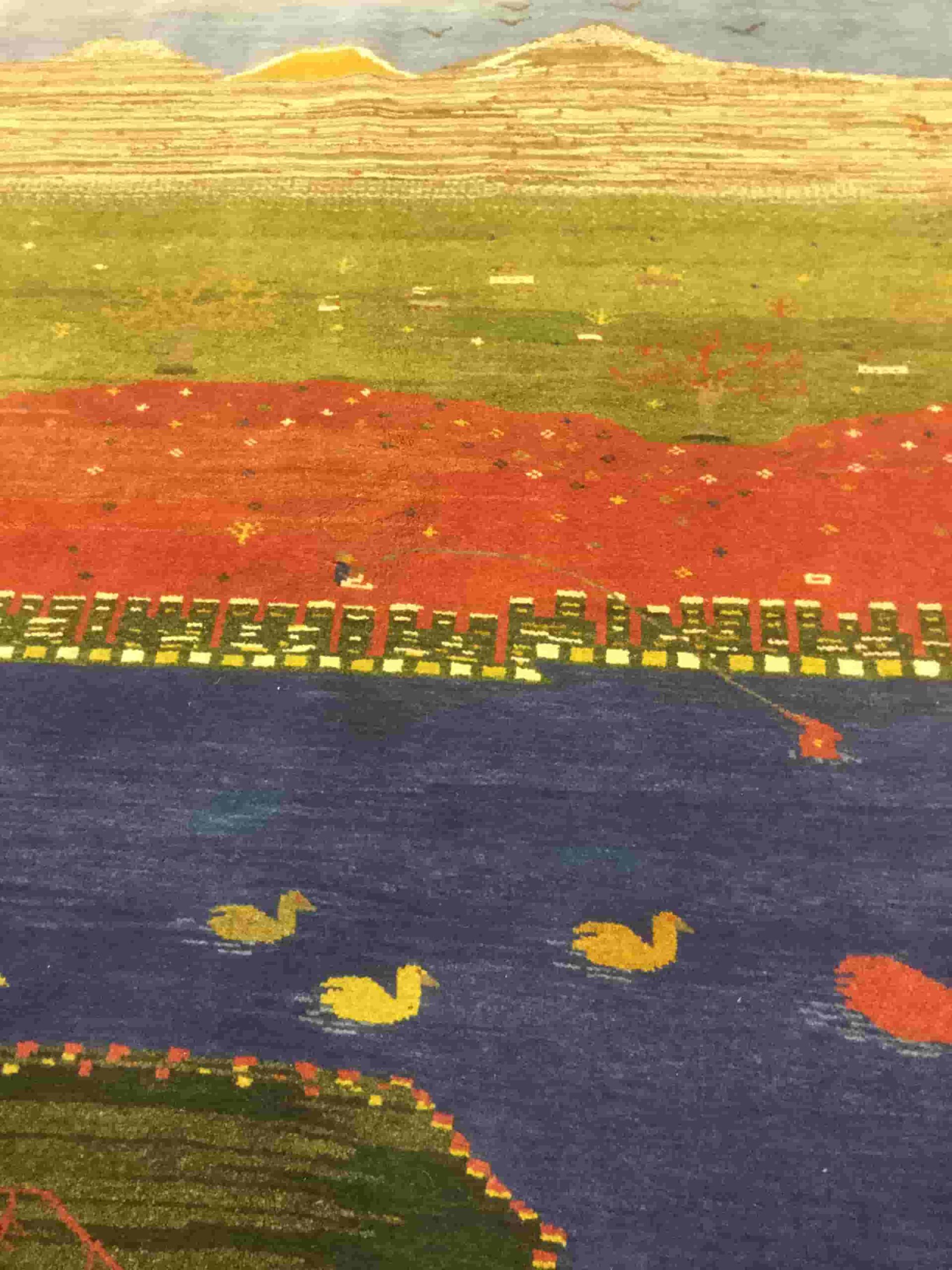 This picturesque Gabbeh is handwoven in Fars Province, located in the south of Iran—a region renowned for its authentic tribal rugs and traditional craftsmanship.