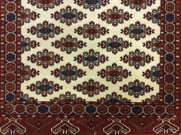 This rug showcases a simple yet striking overall pattern featuring classic ram horn and hook motifs—symbols often associated with strength, protection, and heritage in Turkman culture. The clean, geometric layout allows it to complement both traditional and modern interiors.
