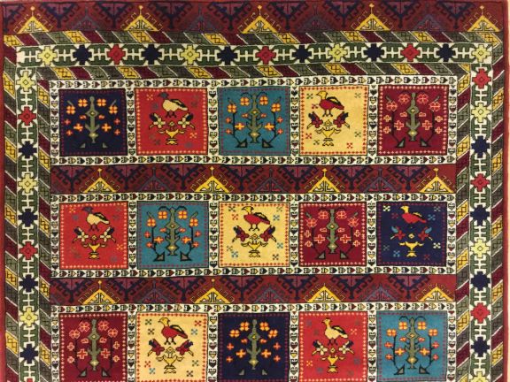 This rare and distinctive rug showcases a simple yet striking overall pattern composed of 25 square panels, each depicting stylized trees, flowers, and animals. The detailed multi-border frame enhances the design, adding depth and visual balance—making it an ideal centerpiece for both classic and contemporary interiors.
